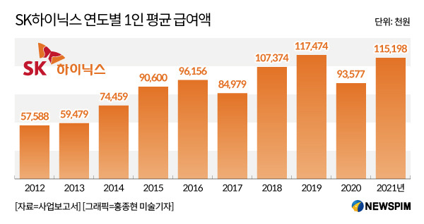 지난 10년간 SK하이닉스의 평균 연봉은 지속적으로 상승하는 추세를 보여왔습니다. 예를 들어, 2012년에는 평균 연봉이 약 57,588,000원이었으나, 2021년에는 115,198,000원으로 증가했습니다. 특히 2019년에는 평균 연봉이 117,474,000원으로 피크를 기록했습니다.